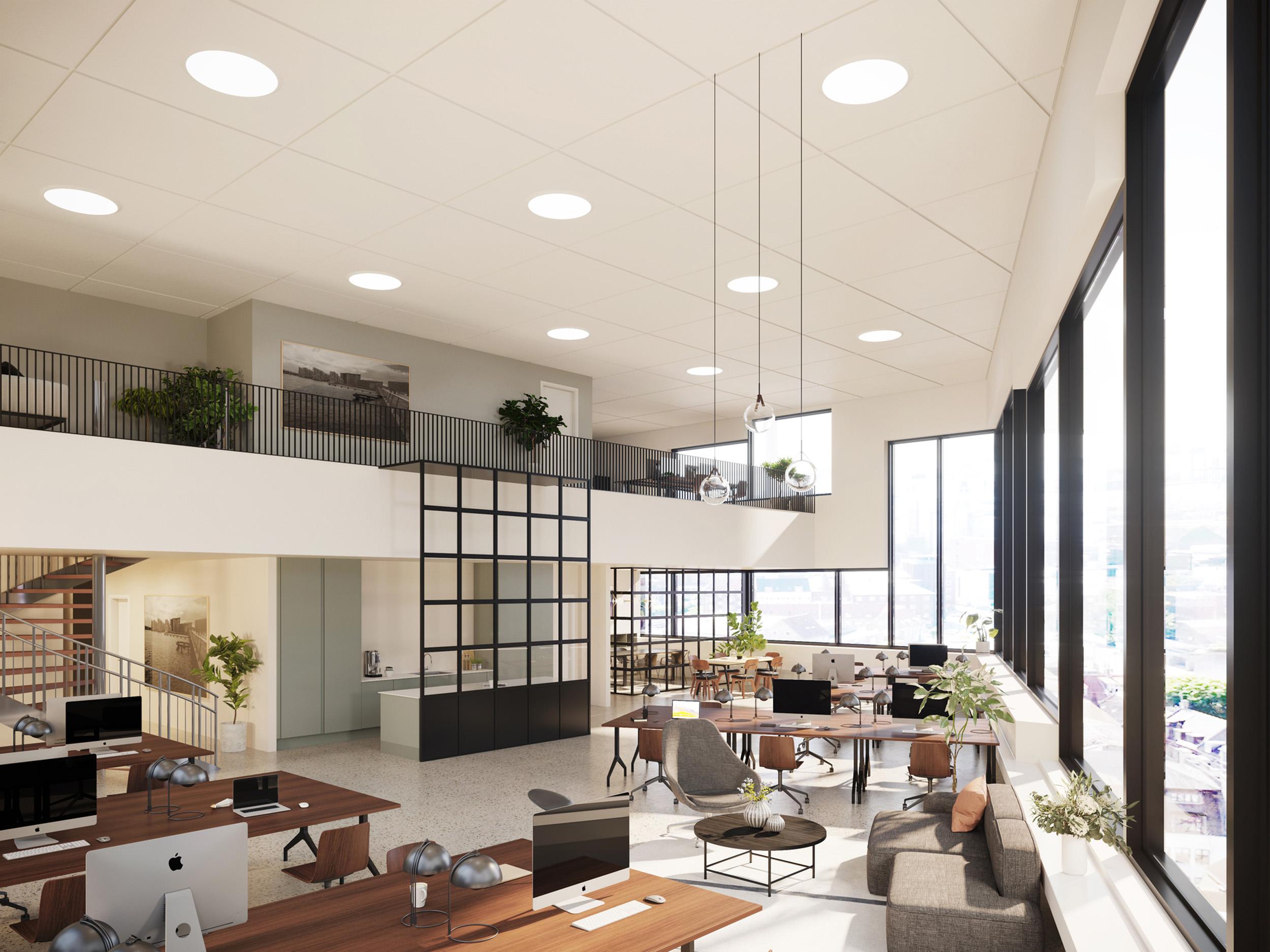 Creëer een passend systeemplafond met de verlichting op de juiste plek, al dan niet aangevuld met opaalplaten of rasters voor luchtcirculatiesystemen.